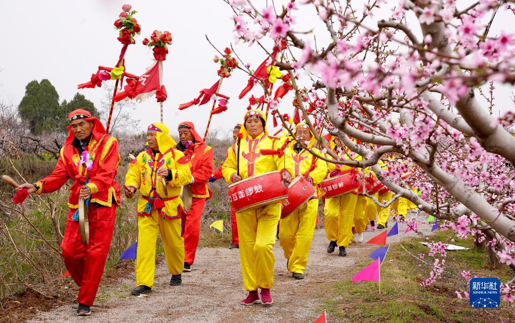 3月24日,在陜西省西安市臨潼區零口街道零塬村,當地的非物質文化遺產“百面鑼鼓”隊伍穿行于桃園中。