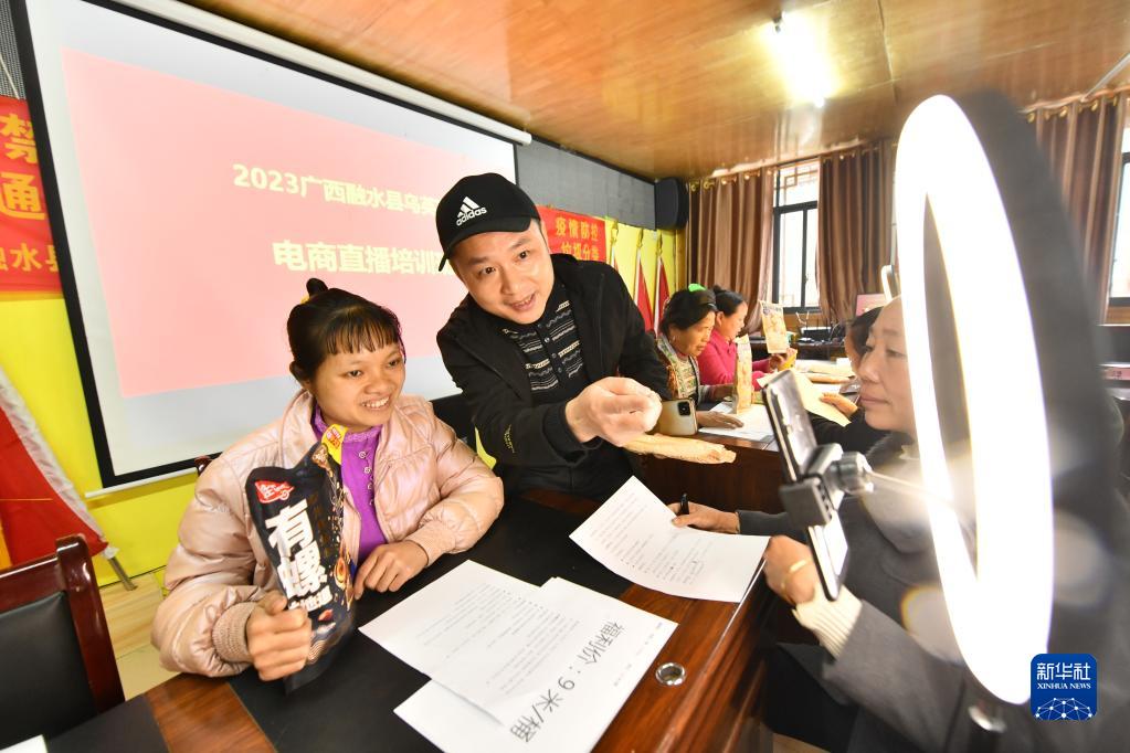 3月24日,在廣西融水苗族自治縣桿洞鄉黨鳩村,村民在學習電商直播技能。