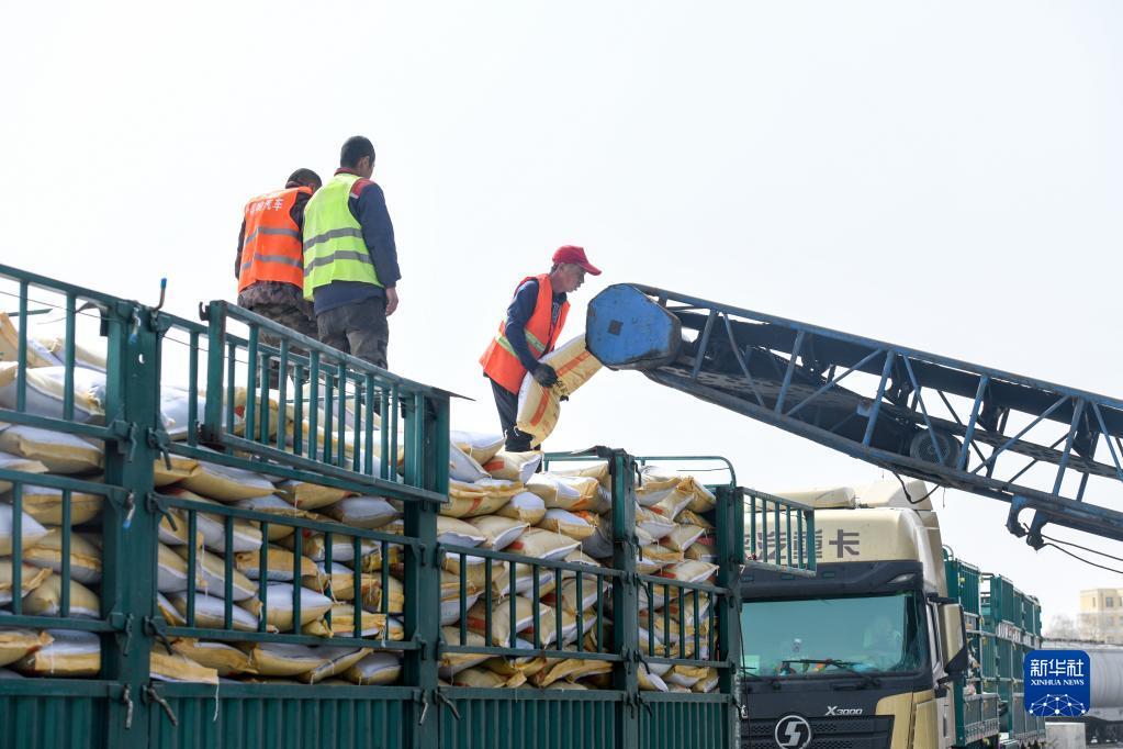 3月23日,工人們在寧安站貨場卸化肥。