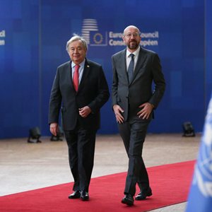 3月23日,聯合國秘書長古特雷斯(左)與歐洲理事會主席米歇爾抵達比利時布魯塞爾的歐盟總部準備出席歐盟峰會。