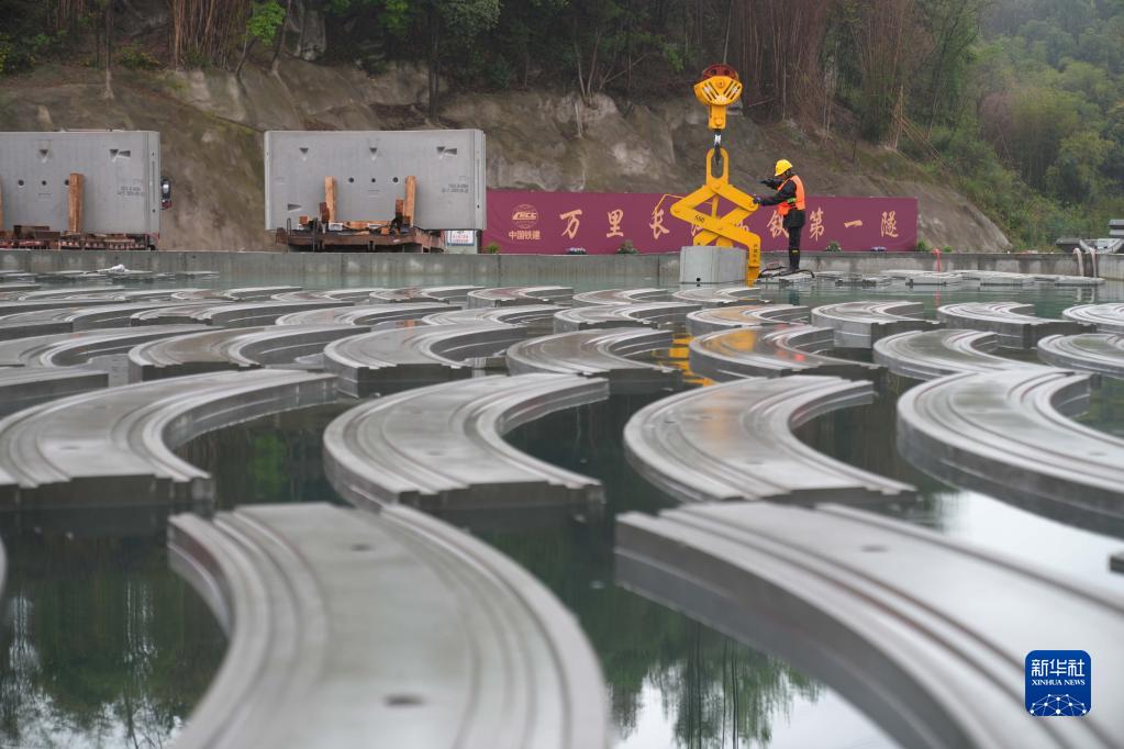 3月24日,在中鐵十四局重黔鐵路管片場,工人在水養池進行管片入水養護作業。