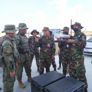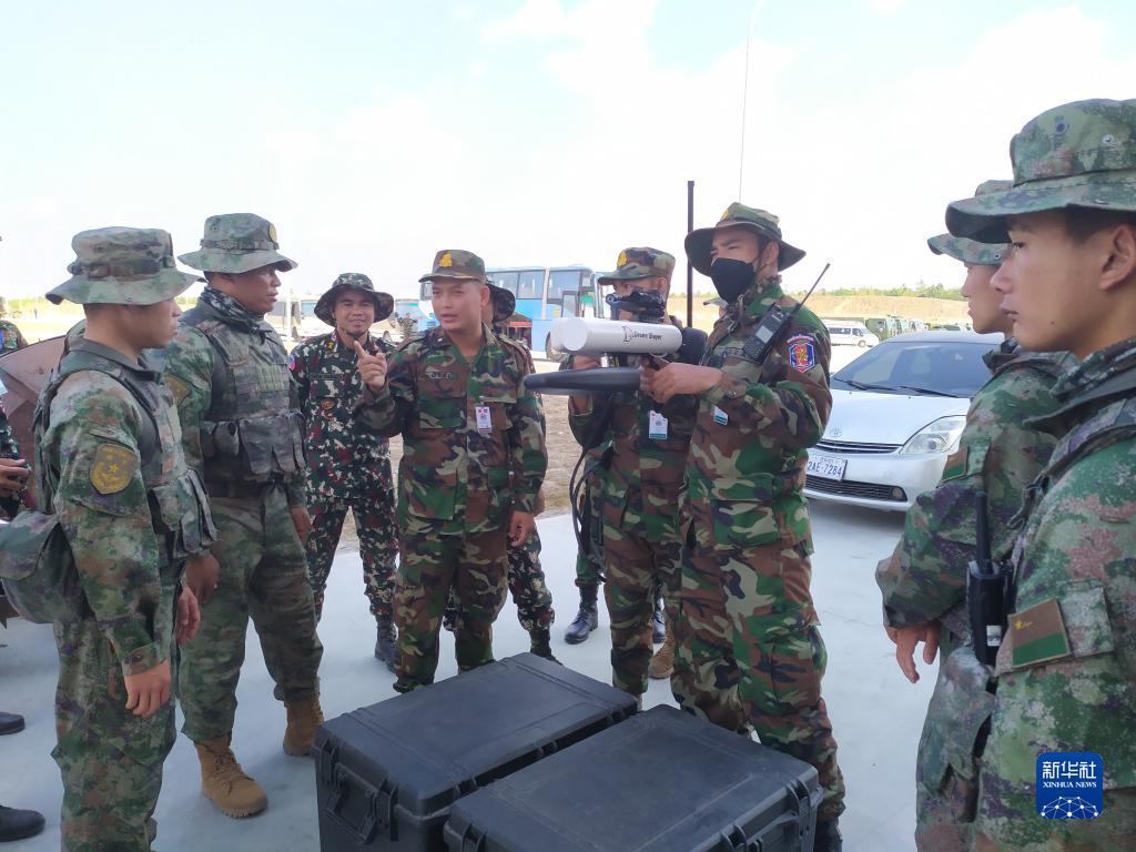 3月24日,在柬埔寨王家軍某訓練基地,中柬參演官兵開展裝備操作訓練,熟悉了解對方武器裝備性能。