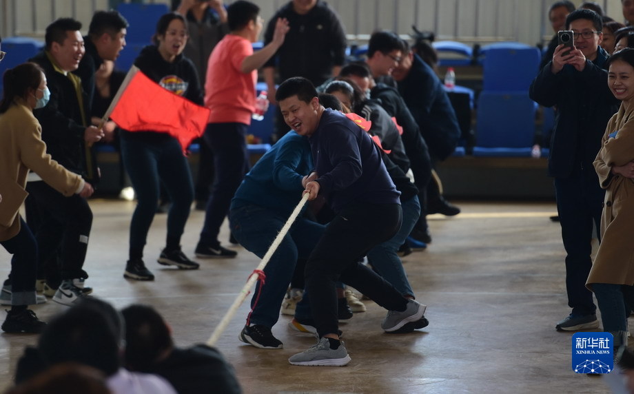 3月24日,國家稅務總局青縣稅務局的工作人員在運動會上進行拔河比賽。新華網發(彭新 攝)
