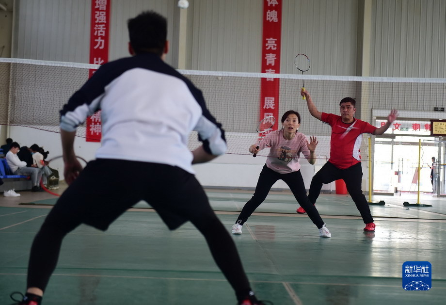 3月24日,來自黨建聯建共建單位的工作人員在進行羽毛球比賽。新華網發(彭新 攝)