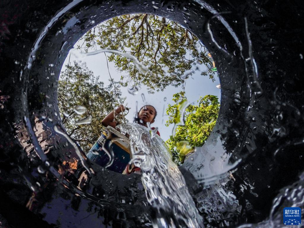 3月22日,在菲律賓奎松市的一處水井附近,居民將水倒入桶里。