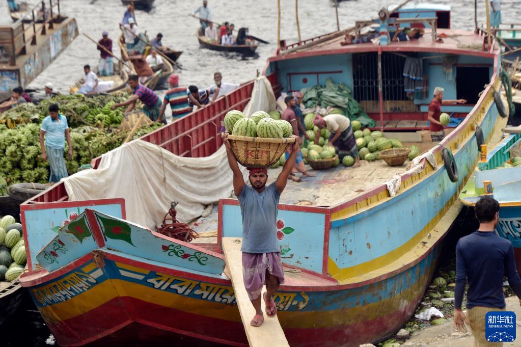 3月21日,工人在孟加拉國達卡的一座批發市場附近搬運西瓜。