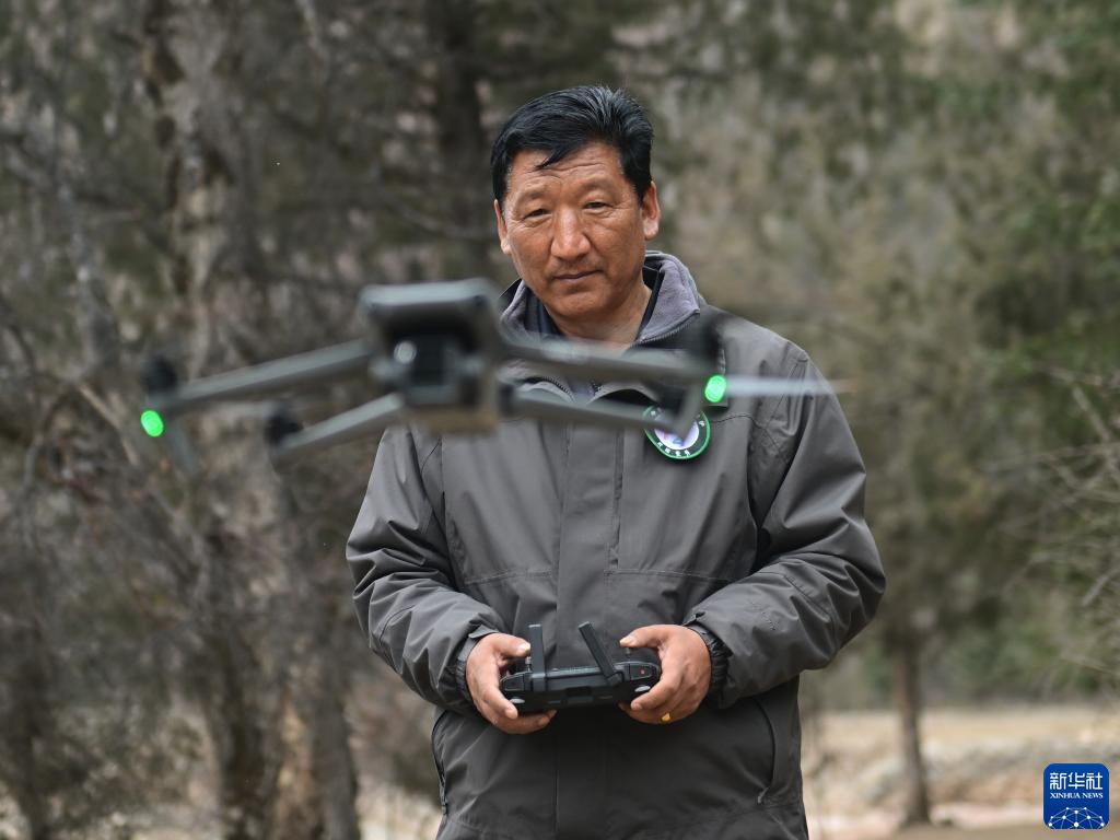 3月24日,在青海省黃南藏族自治州麥秀林場,護林員使用無人機巡護林區。