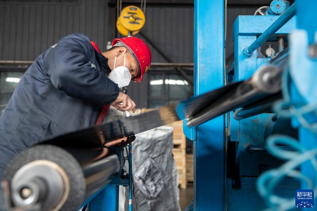 3月24日,在雞西哈工碳基材料科技有限公司柔性石墨紙生產車間,工人在測量石墨紙厚度。
