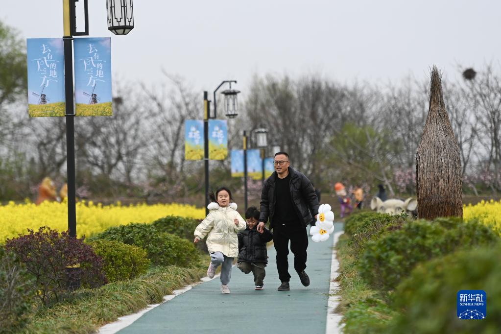 3月25日,游客在八里店鎮移沿山生態景區的油菜花海內游玩。