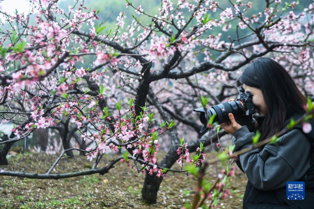 3月25日,游客在半山村的桃園內拍攝桃花。