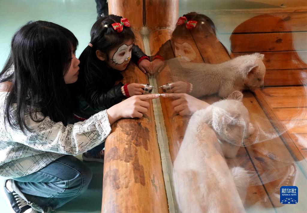 3月24日,游客在銀基動物王國內觀看小獅子。