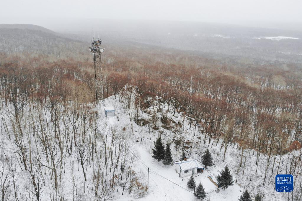 3月23日拍攝的位于中國龍江森工集團沾河林業局有限公司施業區內的彩芹瞭望塔和森林防火瞭望員平時生活的塔下小屋(無人機照片)。