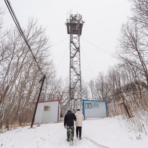 3月下旬,小興安嶺北麓的茫茫林海仍然被積雪覆蓋。在豬山主峰上24米高的彩芹瞭望塔塔頂,圓形的瞭望室內擺放著小床和木桌,森林防火瞭望員每年春秋兩個防火期要在這里待上五六個月的時間。