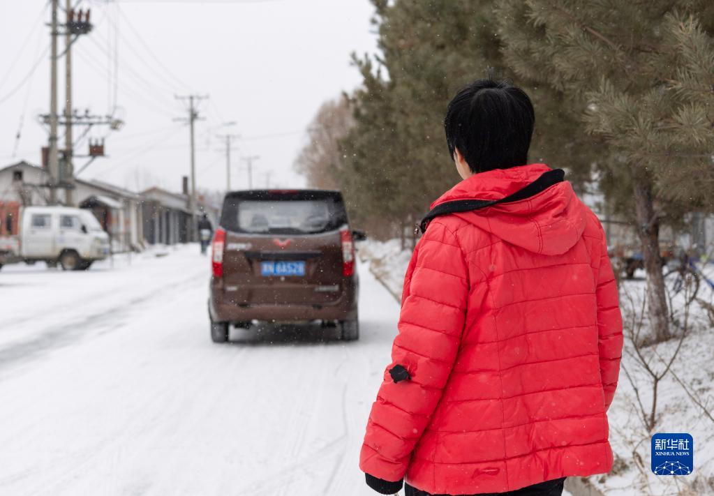 3月22日,在中國龍江森工集團沾河林業局有限公司,朱彩芹目送家人駕車進山。她的丈夫王學堂、兒子王劉洋、兒媳徐盼將在她工作了30年的彩芹瞭望塔上開啟新一年的森林防火瞭望工作。