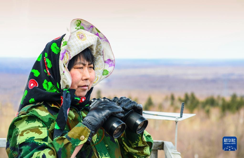 朱彩芹在瞭望塔上工作(2014年4月8日攝)。