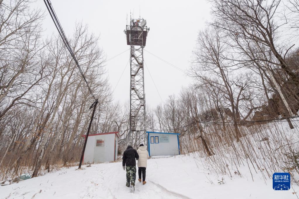 3月23日,在中國龍江森工集團沾河林業局有限公司施業區,王劉洋(左)和徐盼互相攙扶著走向彩芹瞭望塔。他們將上塔調試設備,為正式開始新一年的森林防火瞭望工作做準備。