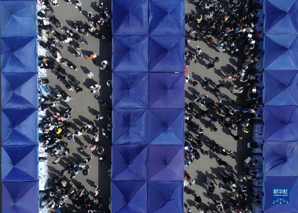 3月25日,求職者參加2023年西安市春季大型人才招聘會(無人機照片)。
