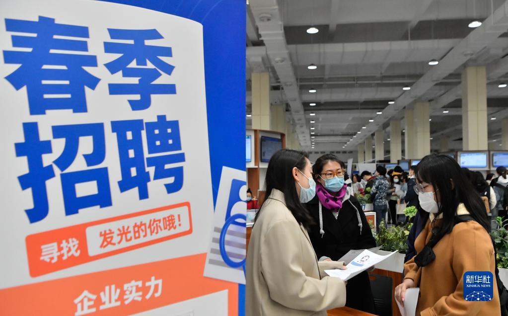 3月25日,在中國(天津)人力資源發展促進中心,招聘企業工作人員與求職者交流。