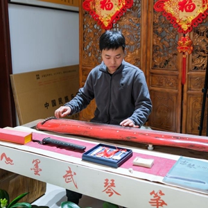 3月25日,斫琴師徐亞沖在徐場村墨武琴坊里彈奏古琴。