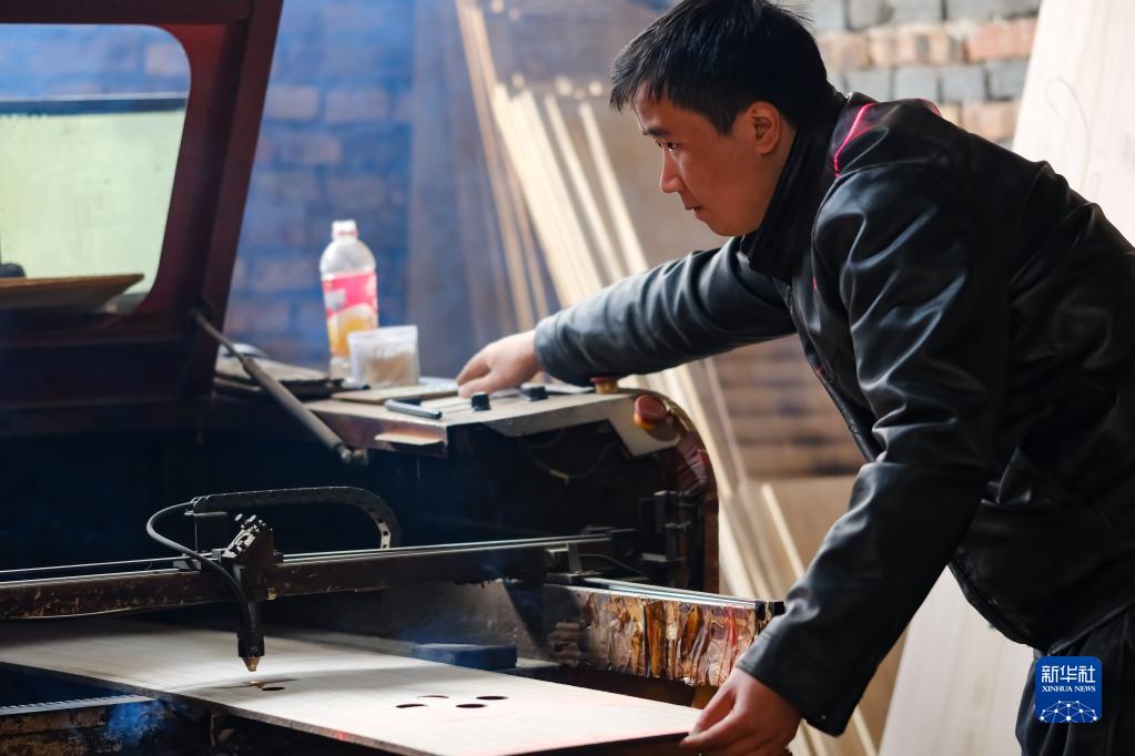 3月25日,村民在徐場村一處民族樂器家庭作坊里制作古箏。