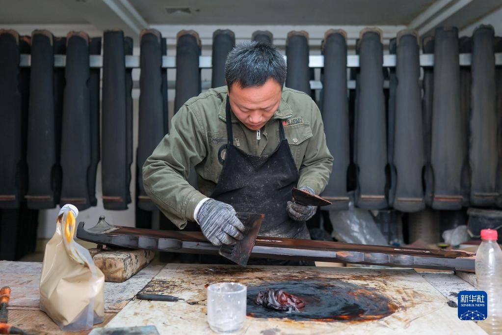 3月25日,村民在徐場村一處民族樂器家庭作坊里制作古琴。