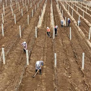 3月25日,昌黎縣昌黎鎮一家酒莊的工人將釀酒葡萄藤出土上架(無人機照片)。