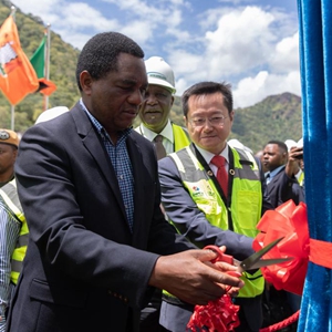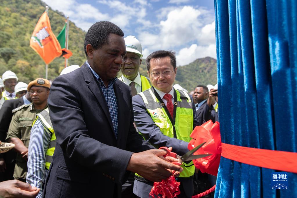 3月24日,在贊比亞南方省,贊比亞總統哈凱恩德·希奇萊馬為下凱富峽水電站5號機組剪彩。