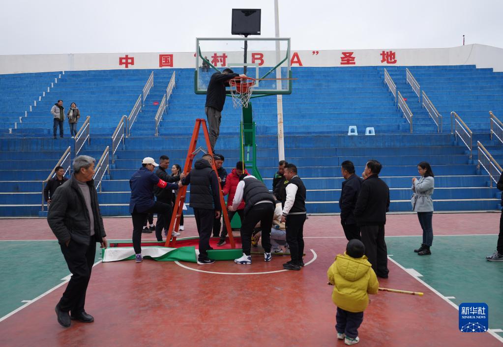 3月25日,比賽開始前工作人員正在調整籃筐。