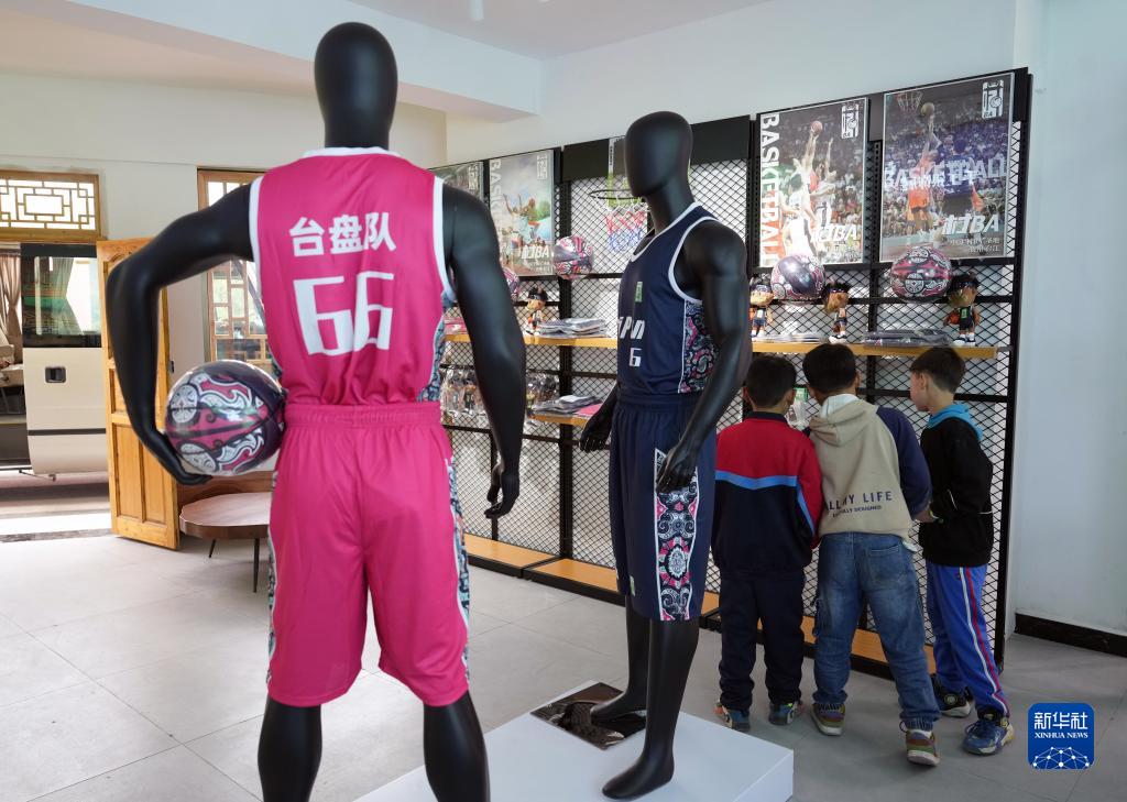 3月25日,幾名男孩正在臺盤村的“村BA官方線下體驗館”里參觀。