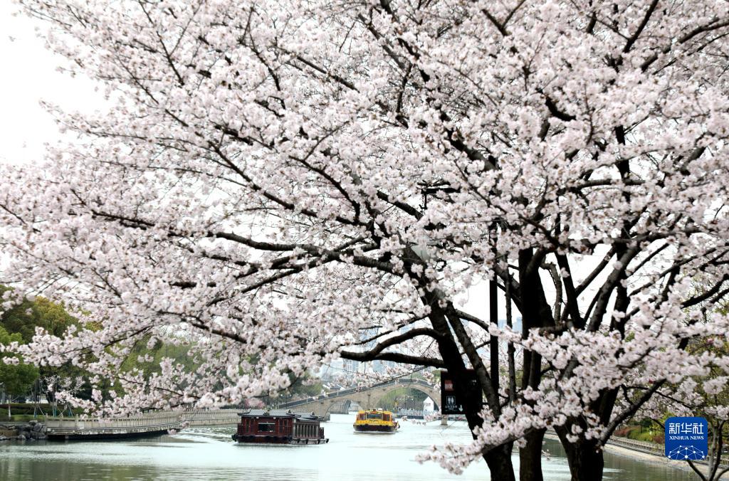 3月25日,在江蘇蘇州環古城河,游船與岸邊盛開的櫻花相映成景。
