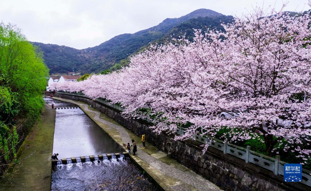 3月25日,游客在浙江省寧波市北侖區大碶街道和鴿村欣賞盛開的櫻花(無人機照片)。