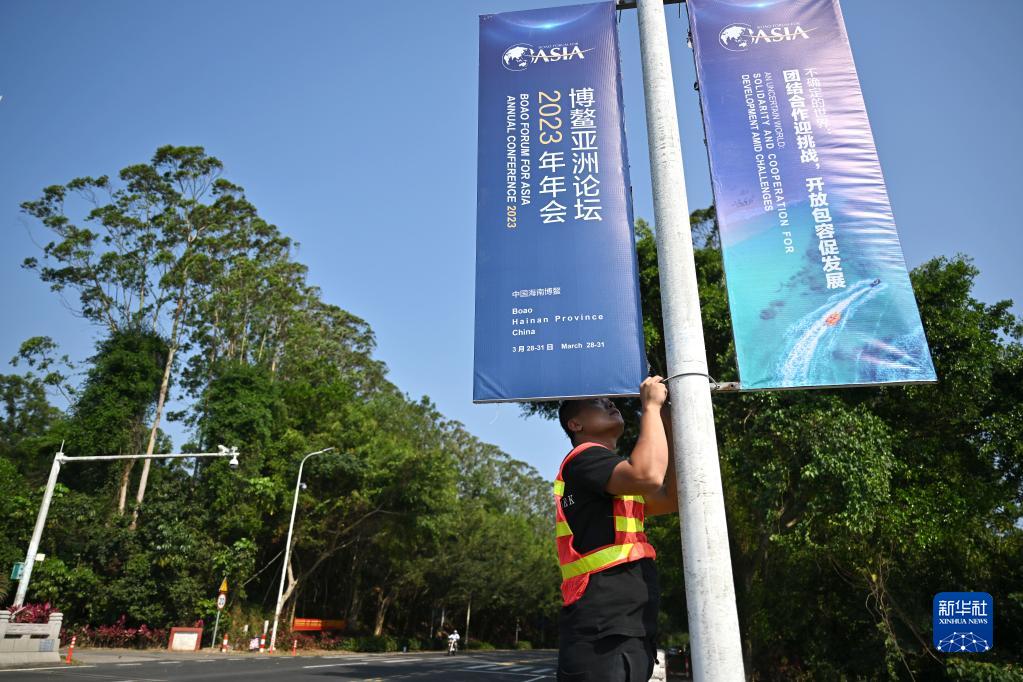 3月23日,工作人員在博鰲鎮懸掛博鰲亞洲論壇2023年年會主題宣傳牌。