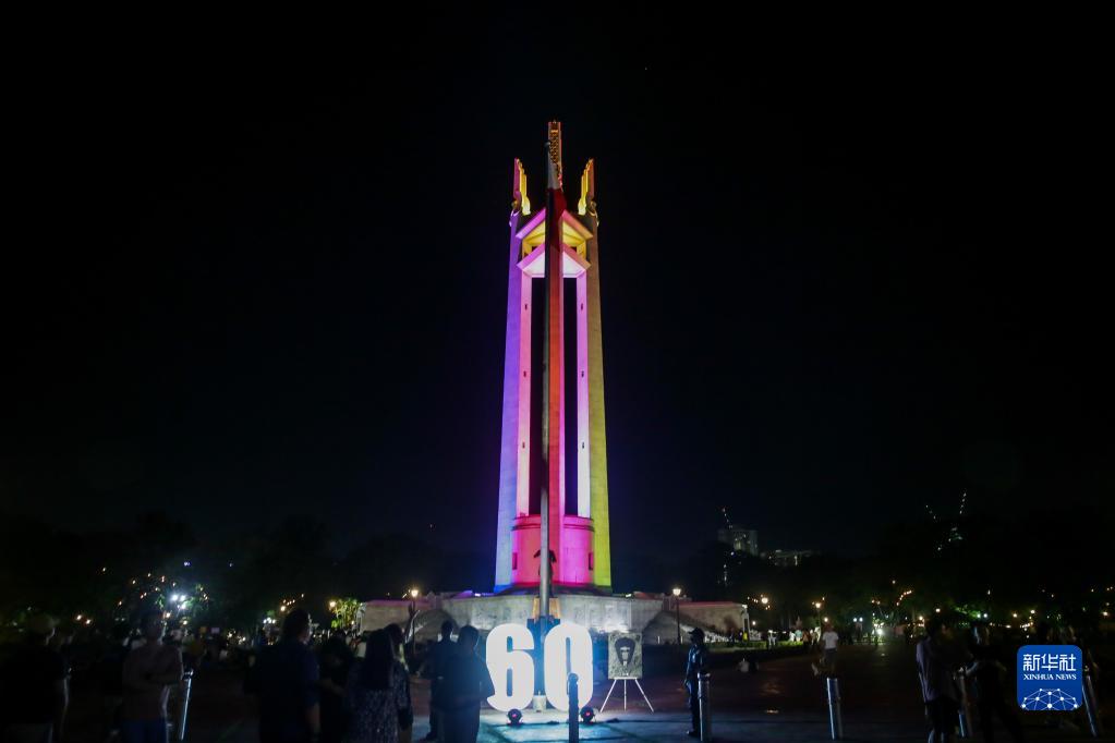 這是3月25日拍攝的菲律賓奎松市的地標建筑奎松紀念碑在“地球一小時”開始前的照片。