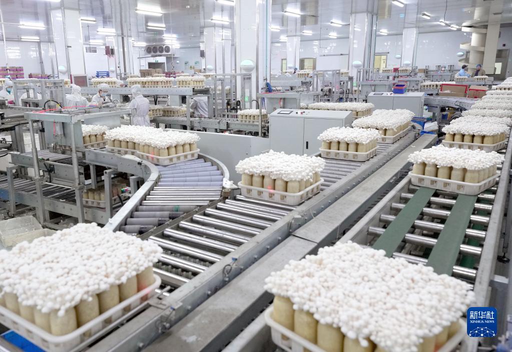 3月25日,河北省昌黎縣大蒲河鎮一家食用菌企業的工人在食用菌分裝線上工作。