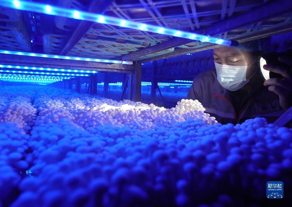 3月25日,河北省昌黎縣大蒲河鎮一家食用菌企業的工人在食用菌培育車間察看白玉菇的生長情況。