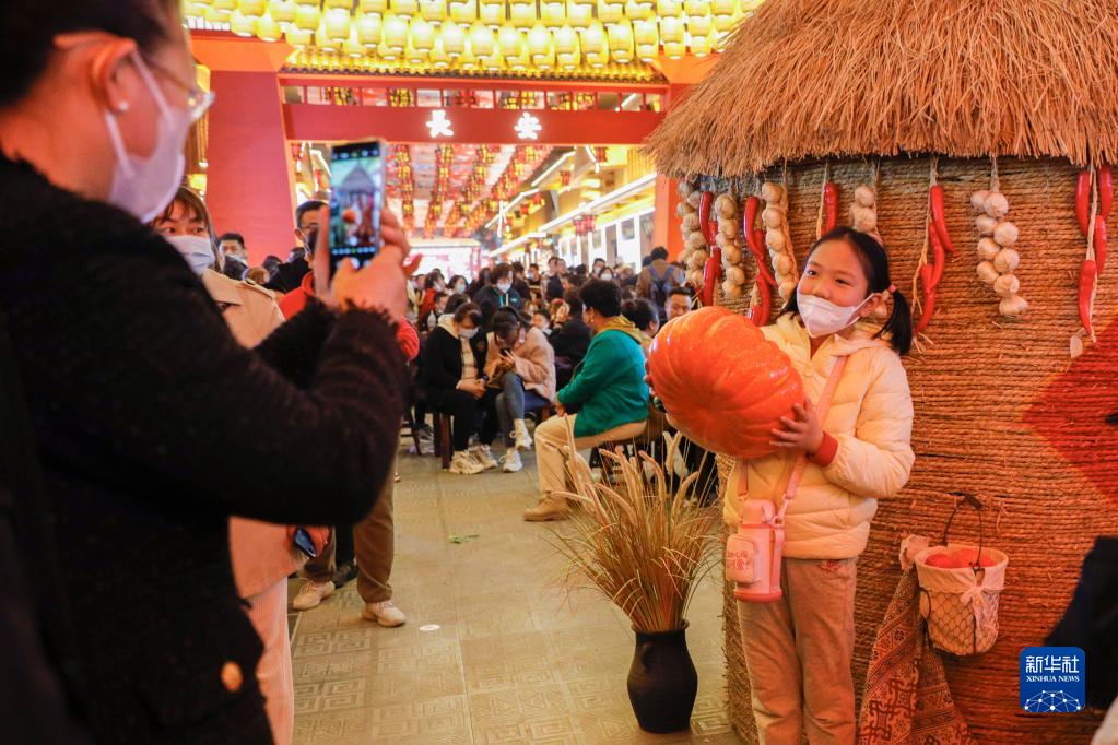 3月25日,小游客在“黃河食渡文化夜市”拍照留念。