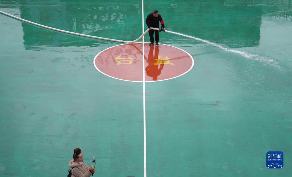 3月26日,“村BA”決賽開始前,一名工作人員清洗球場,一名當地觀眾在場邊做視頻直播。