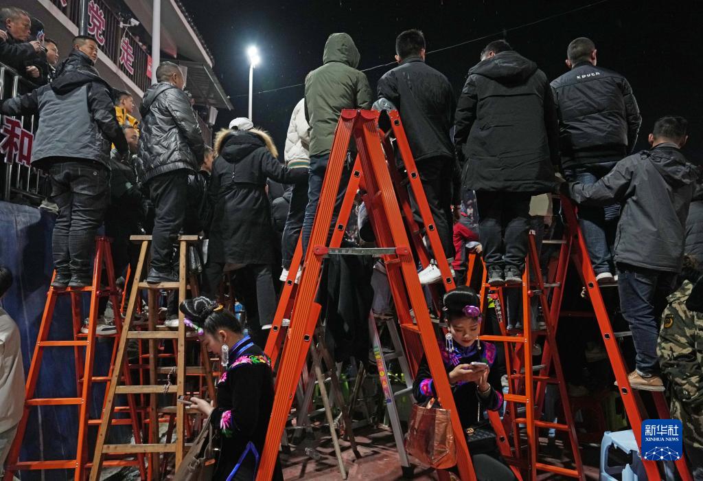 3月26日,“村BA”總決賽賽場邊,當地觀眾搭梯子觀看比賽。