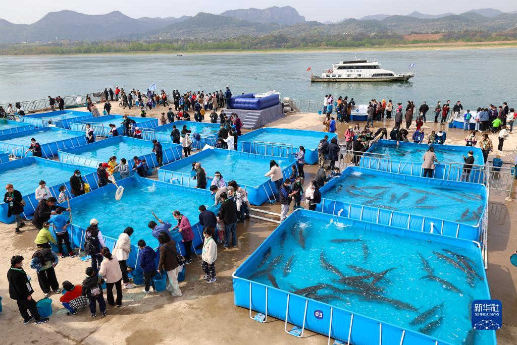 3月26日在湖北省宜昌市胭脂園長江珍稀魚類放流點拍攝的活動現場。