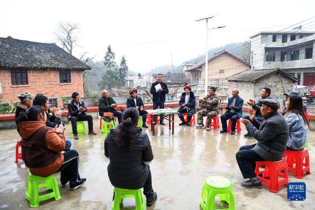 在龍里縣冠山街道高坪村,村民討論管水模式實施情況(2020年12月6日攝)。