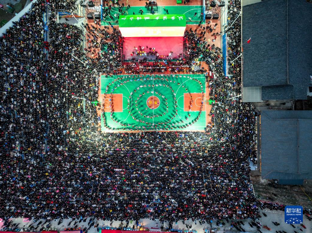 3月26日,比賽開始前,苗族同胞在“村BA”賽場上跳舞(無人機照片)。