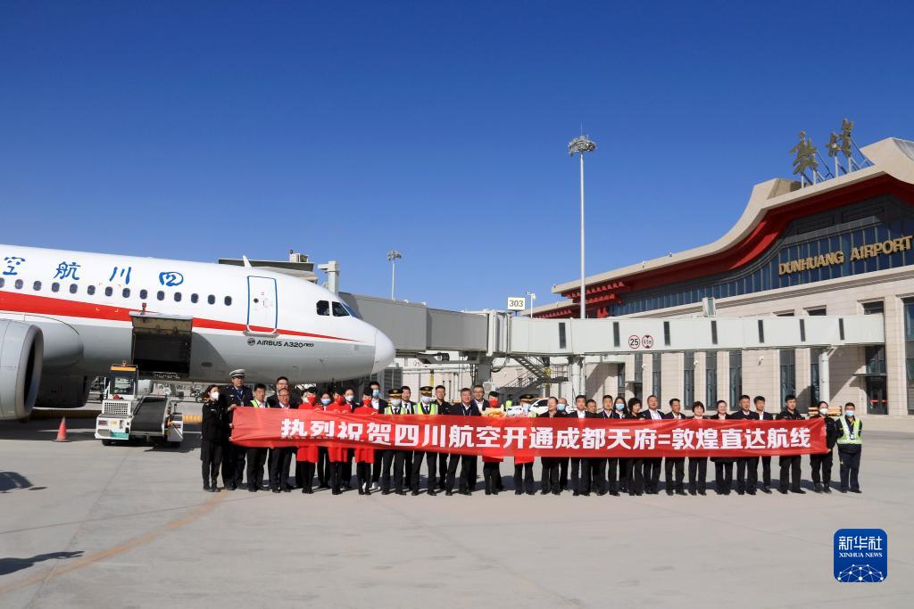 3月26日,由四川航空公司執飛的成都至敦煌往返直達航線正式通航。這是首航航班機組人員與機場工作人員在甘肅敦煌莫高國際機場合影。