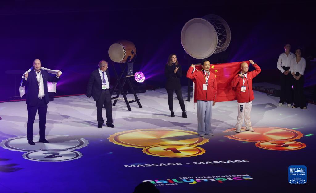 3月25日,在法國梅斯舉行的第十屆國際殘疾人職業技能競賽中,在按摩項目分獲冠軍、季軍的中國選手王?。ㄗ笏模┖屯踅浉ㄗ笪澹┥吓_領獎。