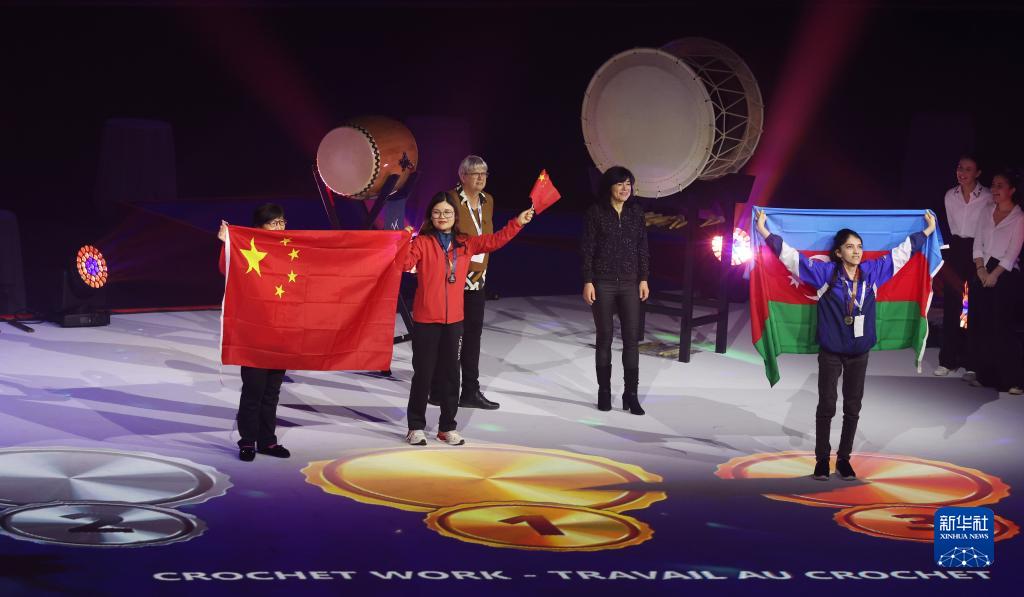 3月25日,在法國梅斯舉行的第十屆國際殘疾人職業技能競賽中,在鉤針編織比賽中分獲冠亞軍的中國選手胡春芳(左二)和沙紅英(左一)上臺領獎。