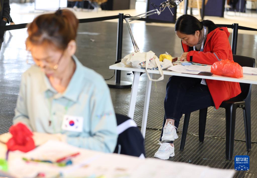3月25日,在法國梅斯舉行的第十屆國際殘疾人職業技能競賽中,中國選手龔蘭(右)參加刺繡比賽。