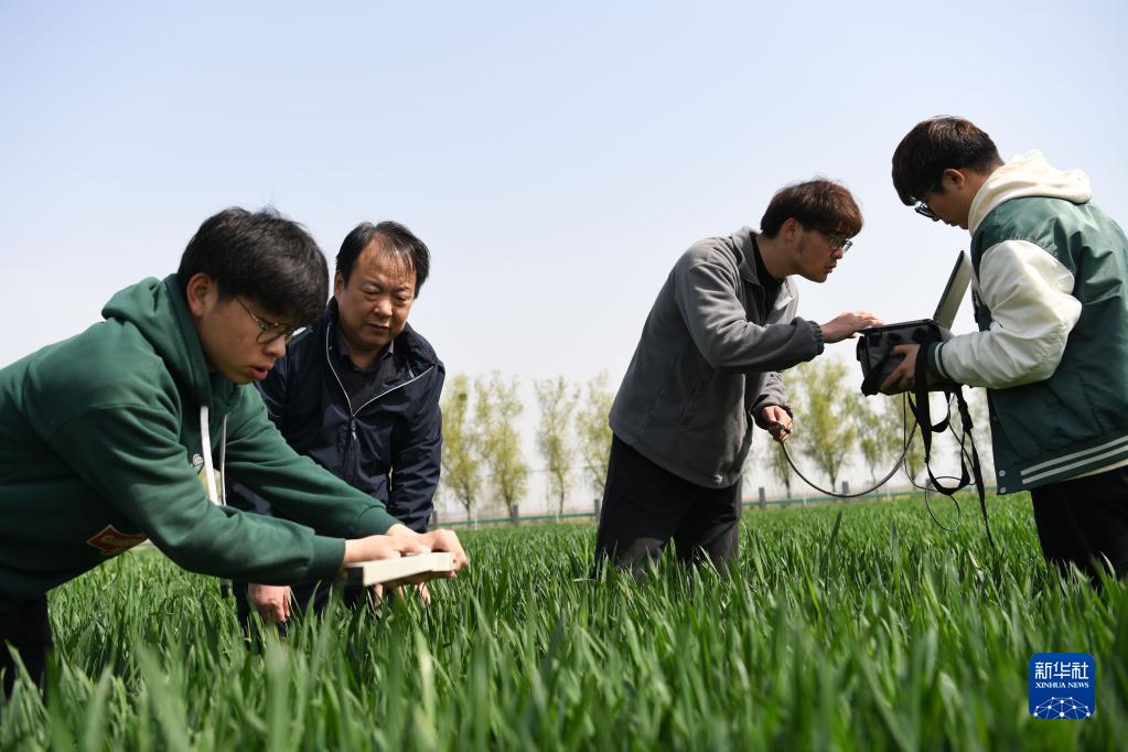 3月26日,在皖中綜合試驗站內,安徽農業大學新農村發展研究院副院長黃正來(左二)在麥田里指導學生進行小麥冠層測量。