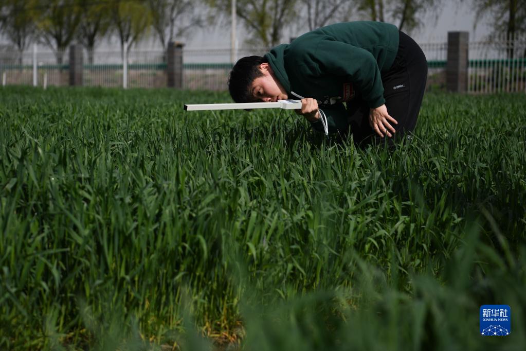 3月26日,在皖中綜合試驗站內,安徽農業大學農學院的學生在對小麥冠層進行測量。
