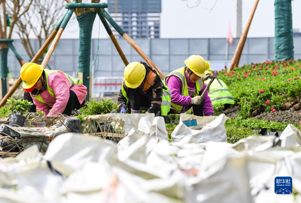 3月27日,在四川省成都市郫都區世界科幻公園建設現場,中建四局的施工人員在進行綠化作業。