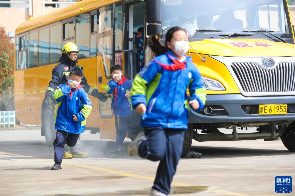 3月27日,浙江省湖州市德清縣三合中心學校學生在消防員的指導下進行校車應急逃生演練。
