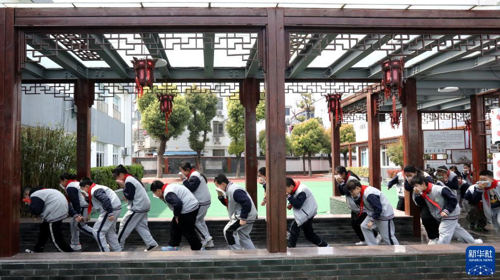 3月27日,江蘇省蘇州市胥江中心小學校的學生進行安全疏散演練。